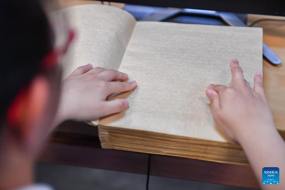 A visually impaired person reads a braille book with fingertips at Changsha Library in Changsha, central China's Hunan province, April 23, 2024. In recent years, Changsha Library has created an accessible reading environment for the visually impaired. The specially designed reading room has more than 10,000 volumes of braille books and journals, over 1,000 audio books and more than 300 accessible movies. Additionally, the library has equipped with reading devices for the visually impaired, such as screen reading software, braille printers and visual aids. The library has also organized cultural activities to bring the joy of reading to the visually impaired group. (Xinhua/Chen Zeguo)