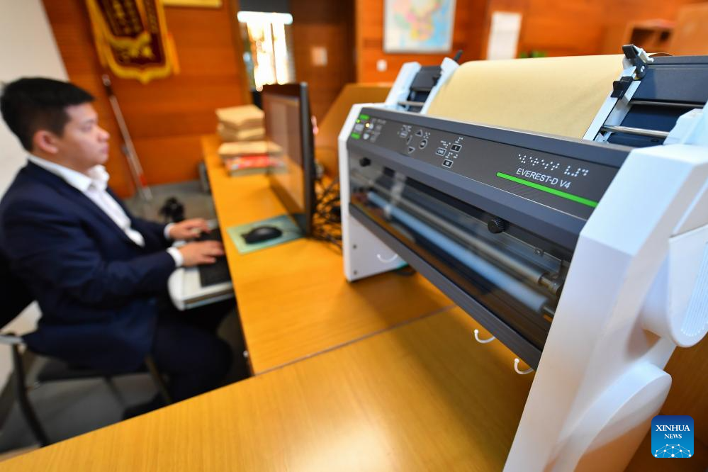 Yao Shenglong, a staff member of Changsha Library, makes braille materials for visually impaired people at Changsha Library in Changsha, central China's Hunan province, April 23, 2024. In recent years, Changsha Library has created an accessible reading environment for the visually impaired. The specially designed reading room has more than 10,000 volumes of braille books and journals, over 1,000 audio books and more than 300 accessible movies. Additionally, the library has equipped with reading devices for the visually impaired, such as screen reading software, braille printers and visual aids. The library has also organized cultural activities to bring the joy of reading to the visually impaired group. (Xinhua/Chen Zeguo)