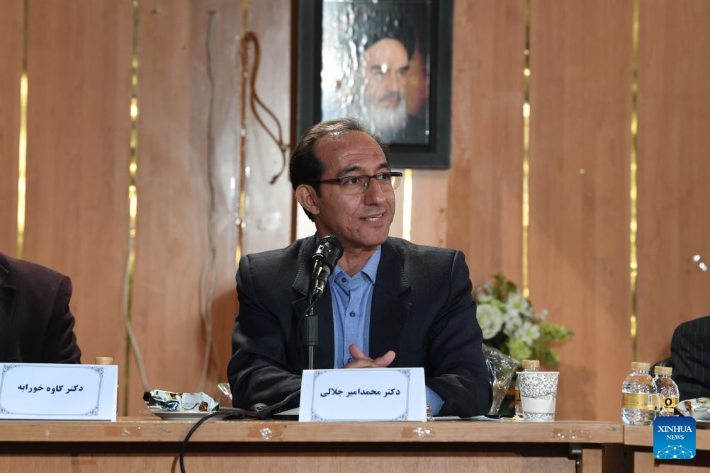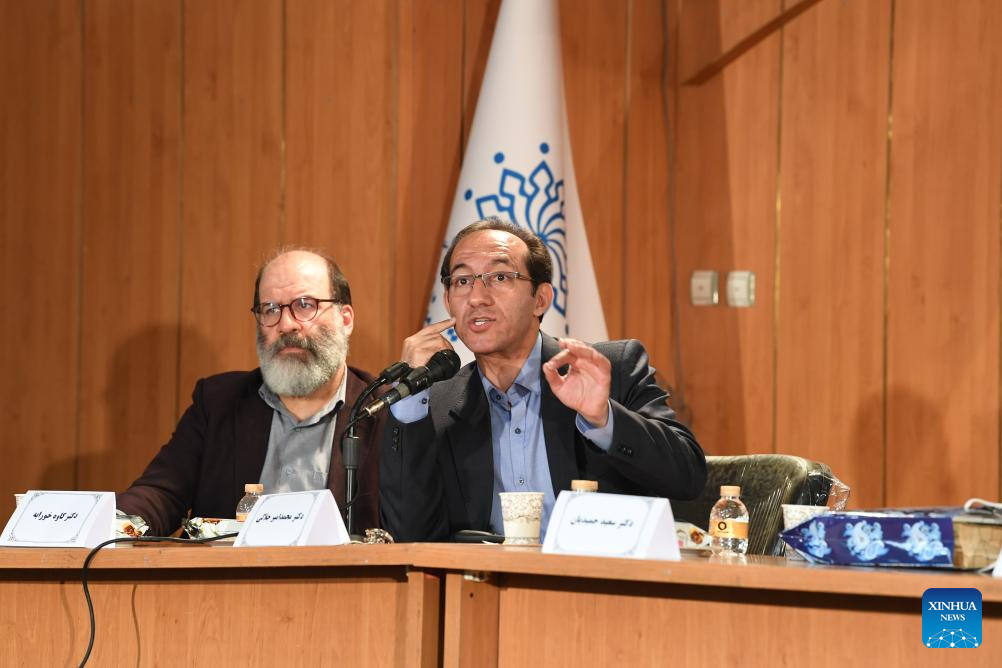 Mohammad-Amir Jalali (R), president of the Center for Chinese Research at Iran's Allameh Tabataba'i University, speaks at a conference to commemorate the prominent Iranian poet and prose writer Saadi Shirazi in Tehran, Iran, on April 22, 2024. Iranian experts have highlighted the significant role culture can play in contributing to the development of Iran-China relations in various fields. (Xinhua/Shadati)