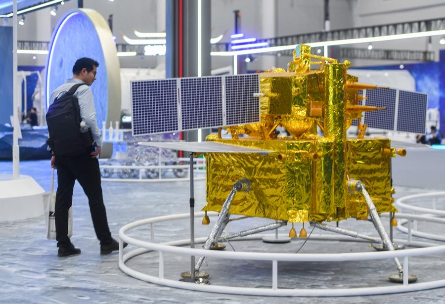 This photo shows a satellite model at an exhibition on aerospace in Wuhan, central China's Hubei Province, April 23, 2024. (Xinhua/Du Zixuan)