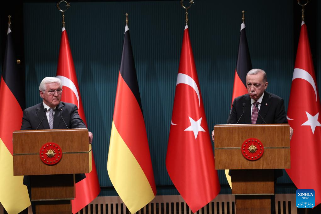 Turkish President Recep Tayyip Erdogan (R) and German President Frank-Walter Steinmeier hold a joint press conference in Ankara, Türkiye, on April 24, 2024. Turkish President Recep Tayyip Erdogan on Wednesday called for greater cooperation between Türkiye and Germany in the defense industry. (Photo by Mustafa Kaya/Xinhua)