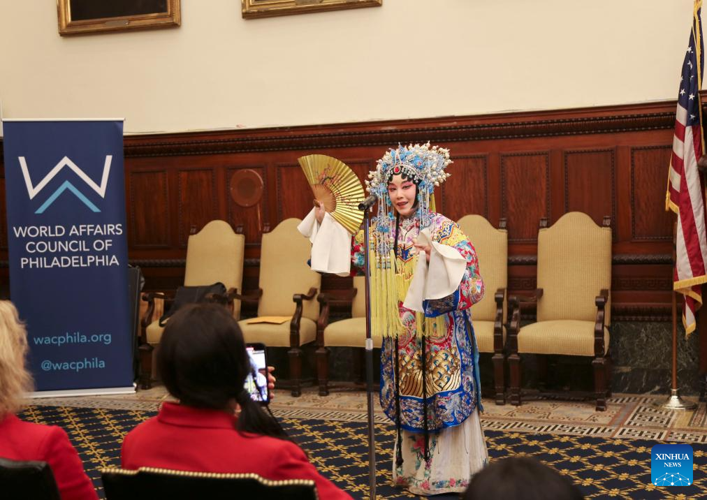 An artist from Tianjin performs Chinese opera at the Philadelphia City Hall in Philadelphia, the United States, April 23, 2024. Tianjin in north China and Philadelphia on the U.S. East Coast celebrated their 45-year sister city ties Tuesday, vowing to deepen cooperation and exchange in various fields. (Xinhua/Liu Yanan)