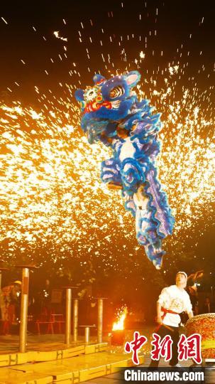 Zhu Tiexiong (right) plays the drum during a lion dance performance accompanied by a performance of Chinese folk art Datiehua, or molten iron fireworks, in a short video in November 2022. (File photo from Zhu Tiexiong)