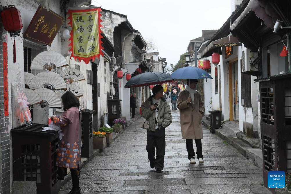 Tourists are pictured at Cangqiao Straight Street in Shaoxing, east China's Zhejiang Province, April 24, 2024. (Xinhua/Weng Xinyang)