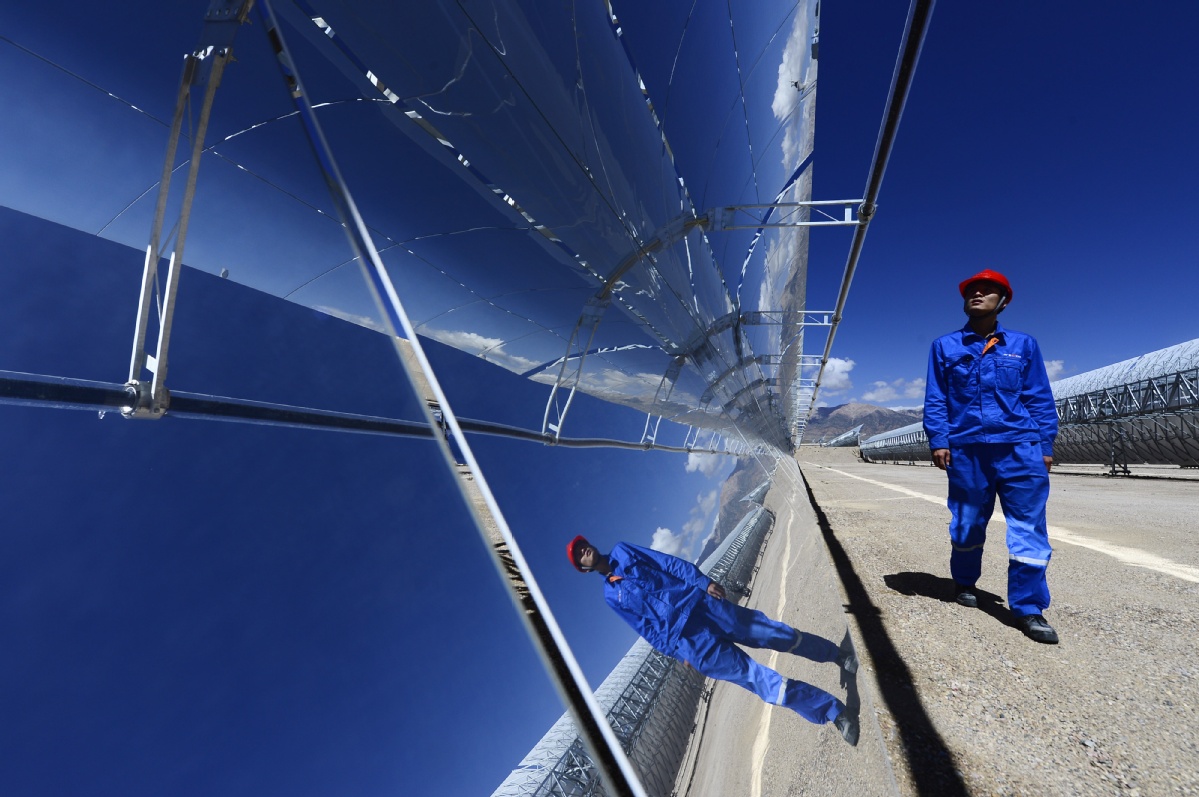 An employee of CGN New Energy Holdings inspects solar panels at a power plant in Golmud, Qinghai province. [Photo/Xinhua]