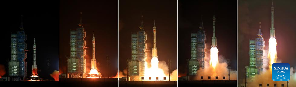 This combo photo shows the Shenzhou-18 manned spaceship, atop a Long March-2F carrier rocket, being launched from the Jiuquan Satellite Launch Center in northwest China, April 25, 2024.?(Xinhua/Li Gang)