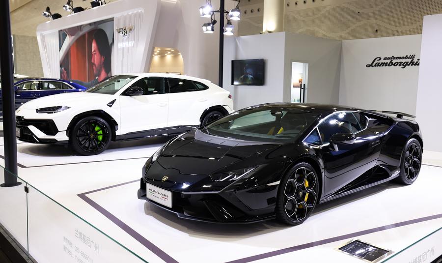 A Lamborghini car is displayed at the fourth China International Consumer Products Expo (CICPE) in Haikou, capital city of south China's Hainan Province, April 15, 2024. (Xinhua/Yang Guanyu)