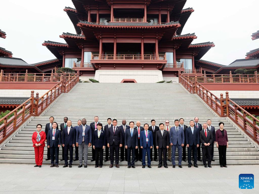 Chinese Vice President Han Zheng takes a group photo with important guests from both China and abroad before the opening ceremony of the International Horticultural Exhibition 2024 Chengdu in southwest China's Sichuan Province, April 26, 2024. Han Zheng on Friday attended and addressed the opening ceremony. (Xinhua/Liu Weibing)