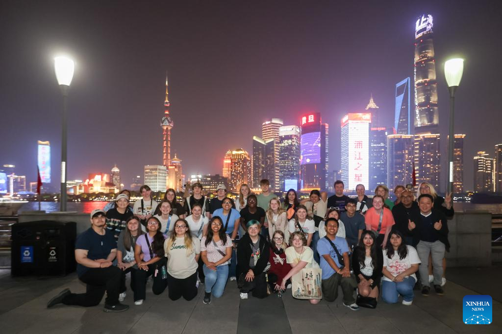 The Muscatine High School delegation poses for a group photo at the Bund area in east China's Shanghai, April 23, 2024. A total of 32 students and eight teachers from Muscatine High School, in the U.S. state of Iowa recently attended a week-long study tour to Beijing, Hebei and Shanghai. The Muscatine High School delegation is part a China-initiated program that will invite 50,000 American youths to China within five years for exchanges and study. The delegation is the second batch from the school. (Xinhua/Wang Xiang)