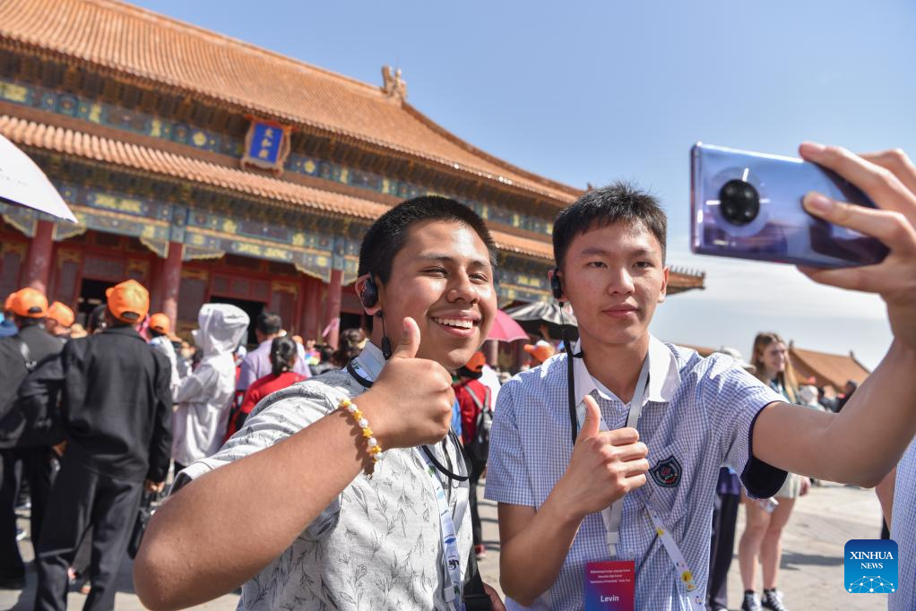 A student (L) of the Muscatine High School delegation takes selfies at the Palace Museum in Beijing, capital of China, April 18, 2024. A total of 32 students and eight teachers from Muscatine High School, in the U.S. state of Iowa recently attended a week-long study tour to Beijing, Hebei and Shanghai. The Muscatine High School delegation is part a China-initiated program that will invite 50,000 American youths to China within five years for exchanges and study. The delegation is the second batch from the school. (Photo by Liu Zunshuan/Xinhua)