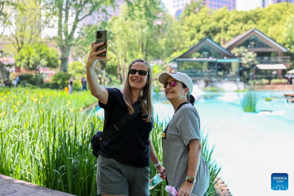 Teachers of the Muscatine High School delegation take selfies at Jing'an Park in east China's Shanghai, April 24, 2024. A total of 32 students and eight teachers from Muscatine High School, in the U.S. state of Iowa recently attended a week-long study tour to Beijing, Hebei and Shanghai. The Muscatine High School delegation is part a China-initiated program that will invite 50,000 American youths to China within five years for exchanges and study. The delegation is the second batch from the school. (Xinhua/Wang Xiang)