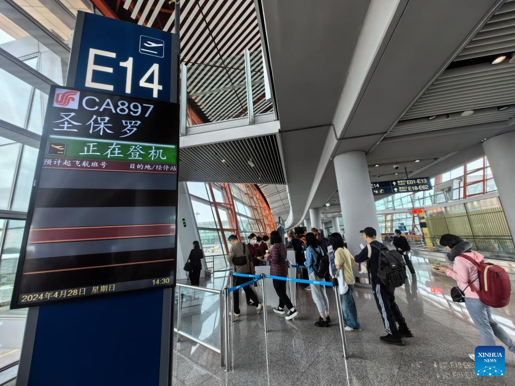 Passengers board flight CA897 of Air China at Beijing Capital International Airport in Beijing, capital of China, April 28, 2024.?(Air China/Handout via Xinhua)