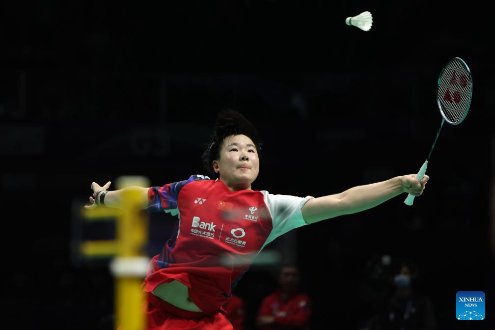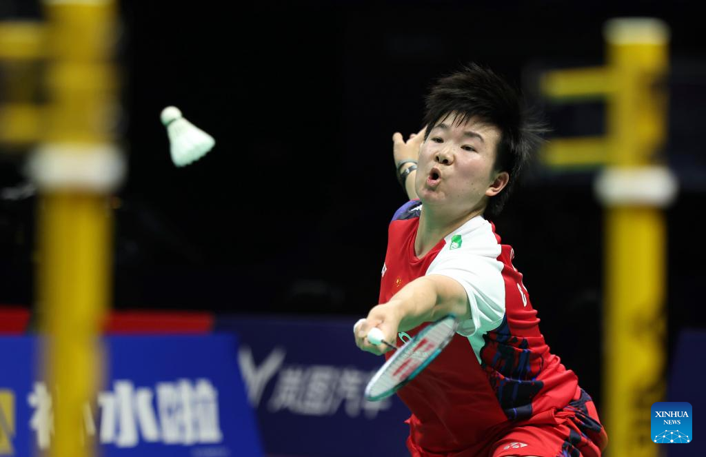 He Bingjiao of China hits a return in the singles match against Michelle Li of Canada during the group A match between China and Canada at BWF Uber Cup Finals in Chengdu, southwest China's Sichuan Province, April 28, 2024. (Xinhua/Chen Bin)
