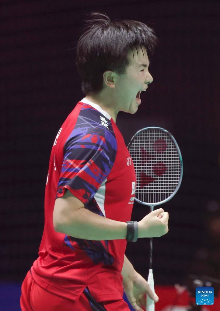 He Bingjiao of China celebrates in the singles match against Michelle Li of Canada during the group A match between China and Canada at BWF Uber Cup Finals in Chengdu, southwest China's Sichuan Province, April 28, 2024. (Xinhua/Chen Bin)