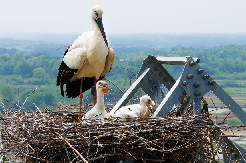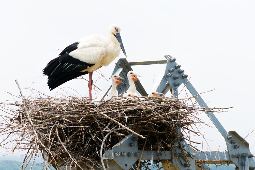 Oriental storks, an endangered bird species under first-class national protection in China, settle in an artificial nest built on an electricity pylon by State Grid Jiangxi Electric Power Co., Ltd., a subsidiary of the State Grid Corporation of China in east China's Jiangxi Province. ?(Photo/Fu Jie)