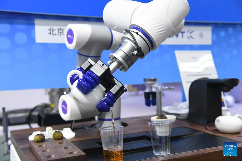 This photo taken on April 28, 2024 shows an intelligent interaction tea art robot platform during a permanent exhibition at the Zhongguancun Exhibition Center in Beijing, capital of China. The permanent exhibition will be opened to the public recently, showcasing more than 430 technologies and products from more than 320 research institutions and enterprises in Beijing in cutting-edge fields such as artificial intelligence, quantum information, commercial aerospace, life and health, and synthetic biological manufacturing. Among them are some of the major achievements released or unveiled at the 2024 Zhongguancun Forum. (Xinhua/Ren Chao)