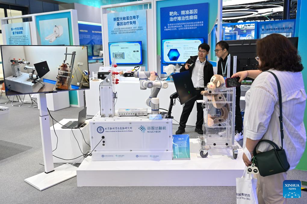 This photo taken on April 26, 2024 shows the NeuCyber Array BMI System, a self-developed brain-machine interface (BMI) system from China, during a permanent exhibition at the Zhongguancun Exhibition Center in Beijing, capital of China. The permanent exhibition will be opened to the public recently, showcasing more than 430 technologies and products from more than 320 research institutions and enterprises in Beijing in cutting-edge fields such as artificial intelligence, quantum information, commercial aerospace, life and health, and synthetic biological manufacturing. Among them are some of the major achievements released or unveiled at the 2024 Zhongguancun Forum. (Xinhua/Li Xin)