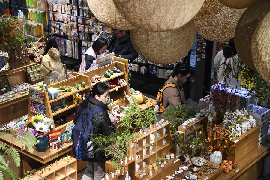 People shop at the Beicang Cultural and Creative Block in Jiangbei District of southwest China's Chongqing Municipality, Feb. 15, 2024. (Xinhua/Wang Quanchao)