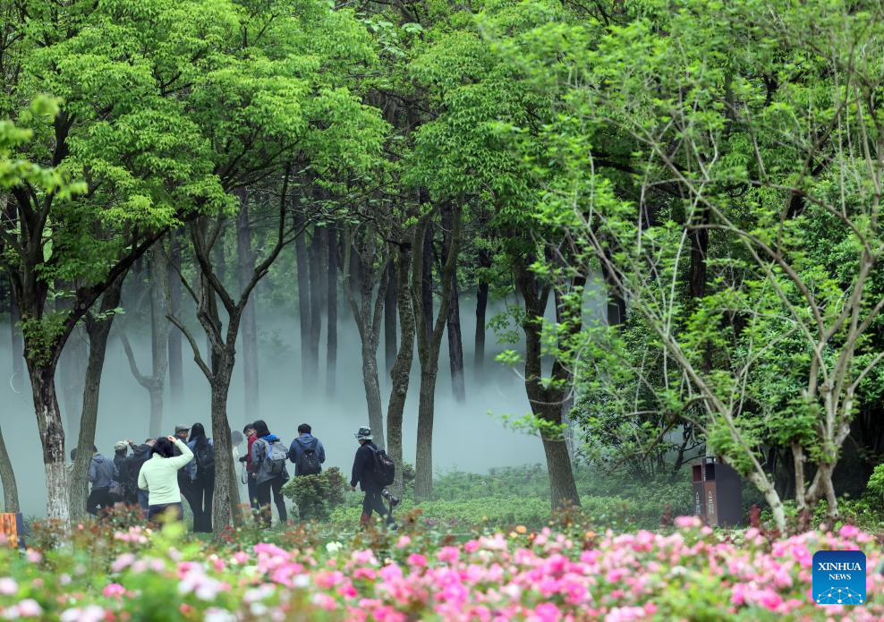 Photographers take pictures at the botanical garden in Jiaxing City, east China's Zhejiang Province, April 27, 2024. Recently, Jiaxing Botanical Garden completed a new round of renovation and attracted many tourists. (Xinhua/Lan Hongguang)