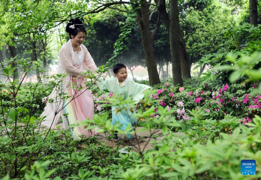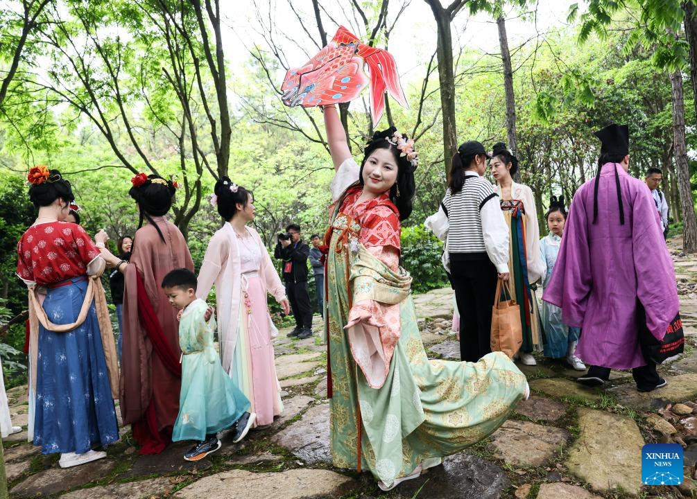 Tourists donning traditional Hanfu attire visit the botanical garden in Jiaxing City, east China's Zhejiang Province, April 27, 2024. Recently, Jiaxing Botanical Garden completed a new round of renovation and attracted many tourists. (Xinhua/Jigme Dorje)