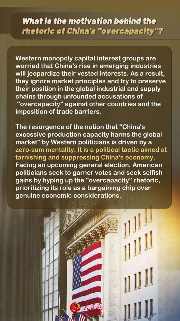 The resurgence of the notion that "China's excessive production capacity harms the global market" by Western politicians is driven by a zero-sum mentality. It is a political tactic aimed at tarnishing and suppressing China's economy.