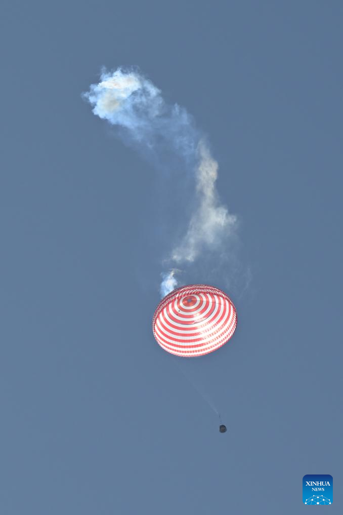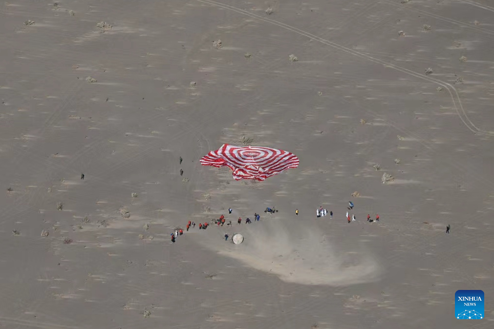 The return capsule of the Shenzhou-17 manned spaceship, carrying astronauts Tang Hongbo, Tang Shengjie and Jiang Xinlin, touches down at the Dongfeng landing site in north China's Inner Mongolia Autonomous Region, April 30, 2024. The three astronauts are all in good health condition, according to the China Manned Space Agency. (Xinhua/Bei He)