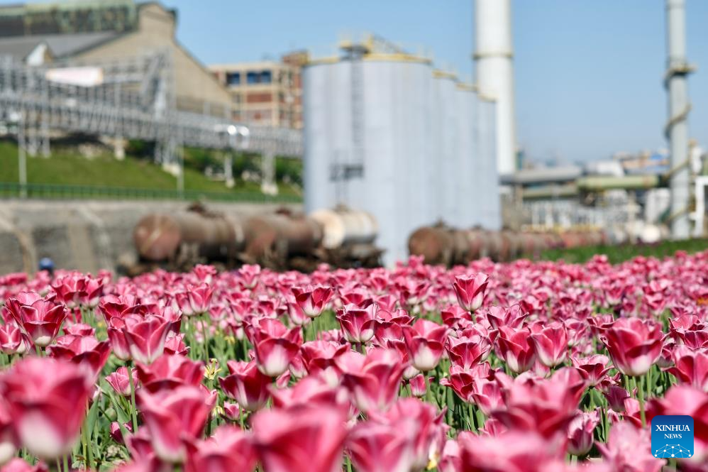This photo taken on April 11, 2024 shows tulips at the smeltery of Serbia Zijin Copper DOO in Bor, Serbia. The city of Bor in Serbia is rich in copper resources. Zijin Mining Group built new and advanced production facilities in the Serbian company and set new standards for environment-friendly mining. (Xinhua/Zheng Kaijun)