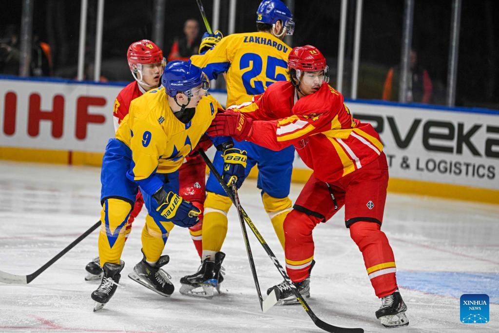 China's Yan Ruinan (1st R) vies with Ukraine's Vitali Lialka (2nd L) during the match between China and Ukraine at the 2024 IIHF Ice Hockey World Championship Division I-B in Vilnius, Lithuania, April 30, 2024. (Photo by Alfredas Pliadis/Xinhua)