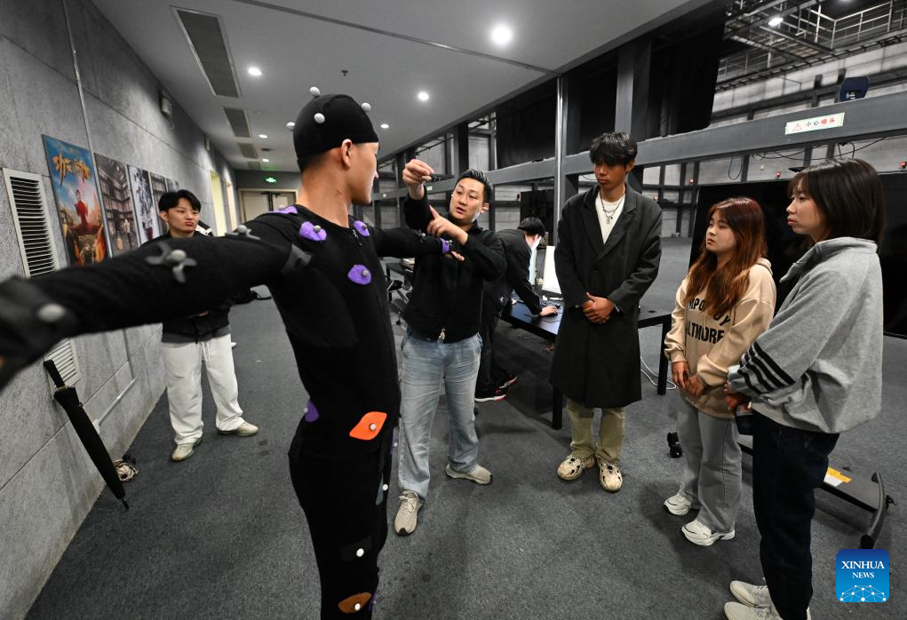 Cui Shengji (C) briefs the movements of a motion capture actor to a colleague at a motion capture booth in the National Animation Industry Park, Binhai New Area, north China's Tianjin Municipality, April 23, 2024. (Xinhua/Zhao Zishuo)