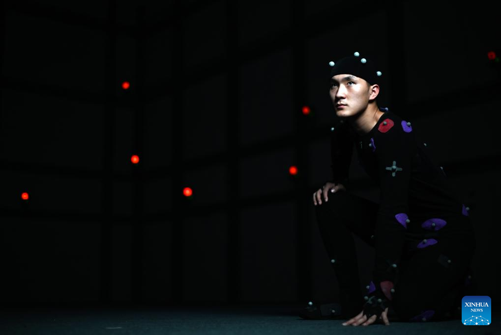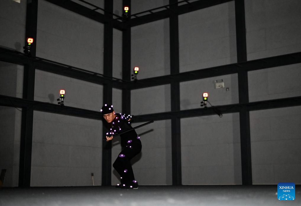 Ma Xinqi performs at a motion capture booth in the National Animation Industry Park in Binhai New Area, north China's Tianjin Municipality, April 23, 2024. (Xinhua/Zhao Zishuo)