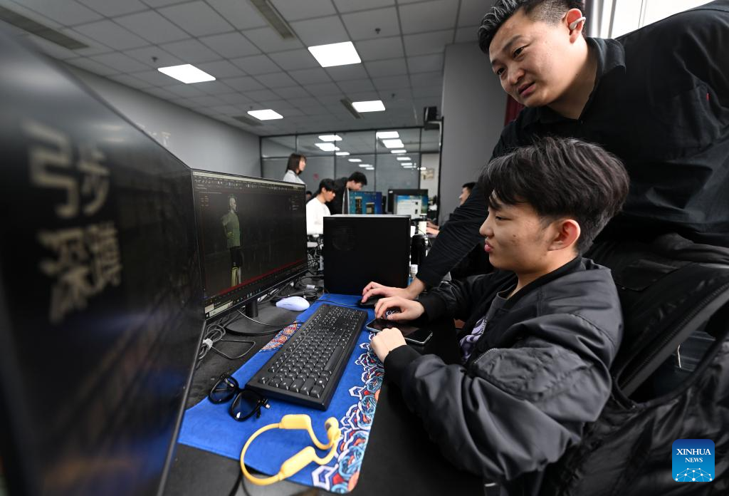 A member of Cui Shengji's studio adjusts movements of a visual character in the National Animation Industry Park in Binhai New Area, north China's Tianjin Municipality, April 23, 2024. (Xinhua/Zhao Zishuo)