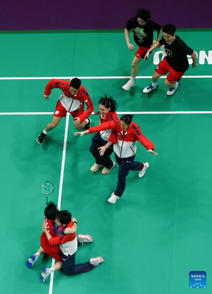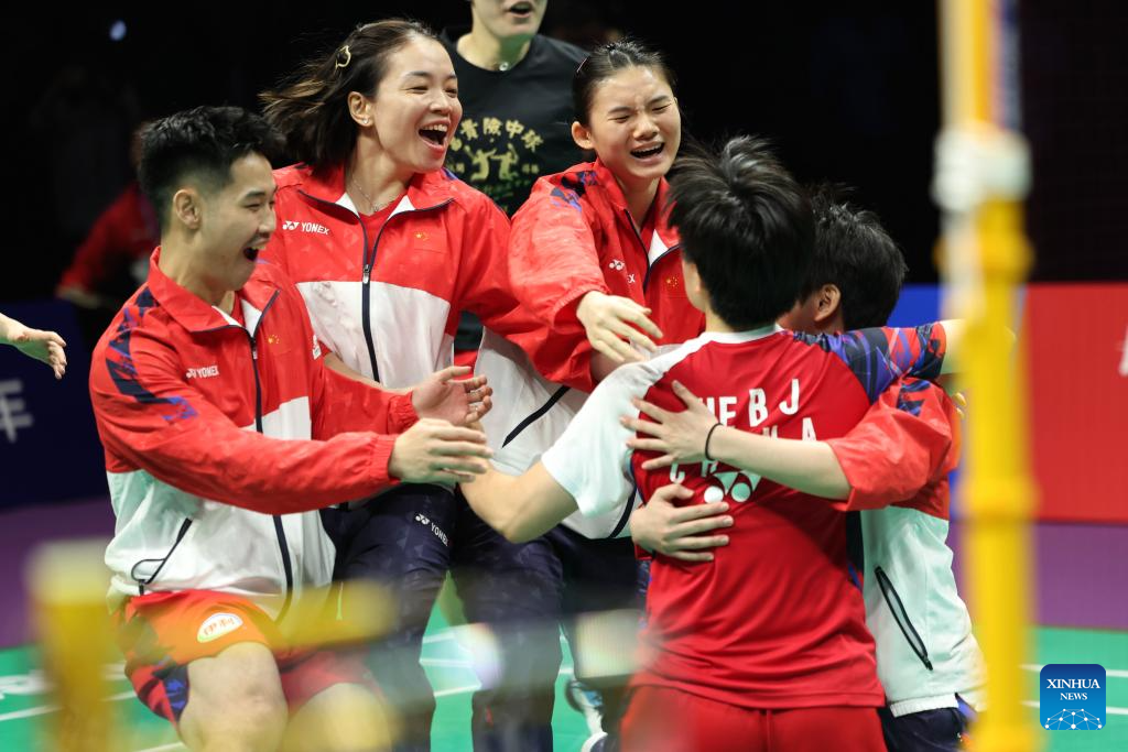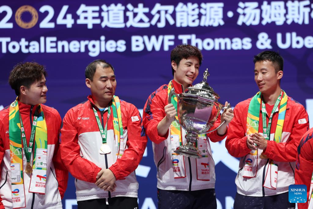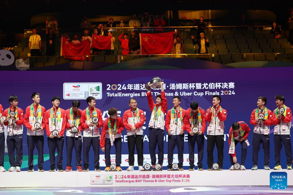 CHENGDU, China, May 5 (Xinhua) -- China's men's team reclaimed badminton's Thomas Cup after a six-year wait after beating Indonesia 3-1, while the women's team also regained the Uber Cup for the first time since 2020 after whitewashing Indonesia 3-0 here on Sunday.