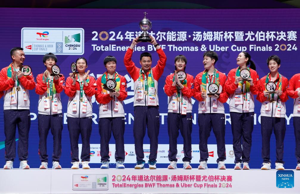 Team China celebrate during the awarding ceremony of the BWF Uber Cup Finals in Chengdu, southwest China's Sichuan Province, May 5, 2024. (Xinhua/Shen Bohan)