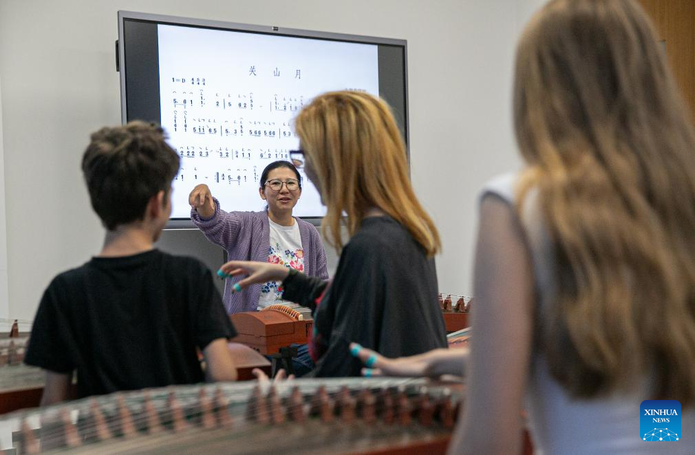 A teacher (rear) instructs during a guzheng (a traditional Chinese musical instrument) class at the China Cultural Center in Belgrade, Serbia, April 29, 2024. The China Cultural Center in Belgrade, jointly built by China's Ministry of Culture and Tourism and the provincial government of Shandong, opened to the public recently. The center covers an area of 6,000 square meters and offers classes on Chinese language, traditional Chinese musical instruments, Chinese calligraphy, and Tai Chi. (Xinhua/Li Jing)