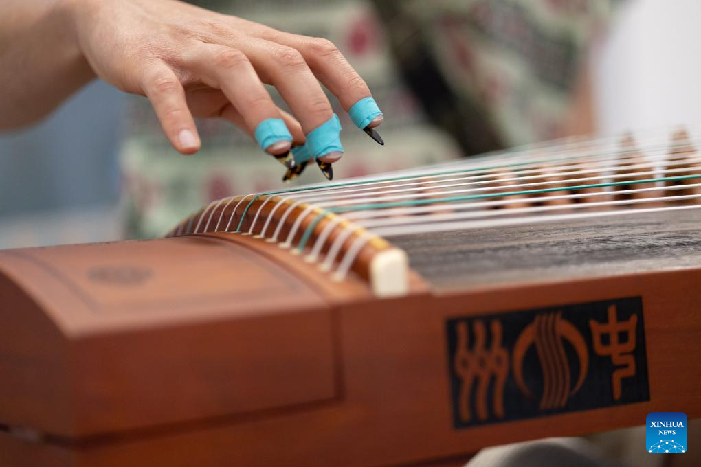 A student practices guzheng (Chinese zither) at the China Cultural Center in Belgrade, Serbia, April 29, 2024. The China Cultural Center in Belgrade, jointly built by China's Ministry of Culture and Tourism and the provincial government of Shandong, opened to the public recently. The center covers an area of 6,000 square meters and offers classes on Chinese language, traditional Chinese musical instruments, Chinese calligraphy, and Tai Chi. (Xinhua/Li Jing)