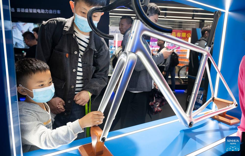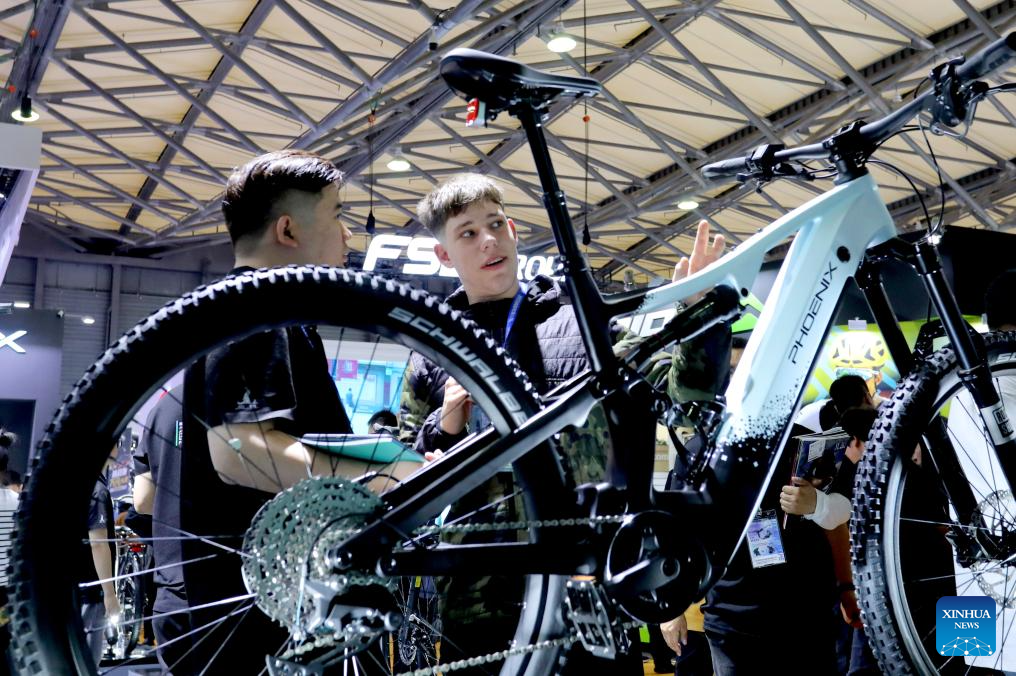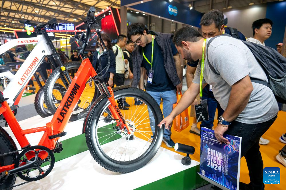 People visit the 32nd China International Bicycle Fair in east China's Shanghai, May 5, 2024. The event kicked off here on Sunday, drawing about 1,460 enterprises to participate. (Xinhua/Cai Yang)