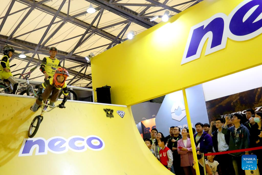 A young athlete performs bicycle stunt show during the 32nd China International Bicycle Fair in east China's Shanghai, May 5, 2024. The event kicked off here on Sunday, drawing about 1,460 enterprises to participate. (Xinhua/Fang Zhe)