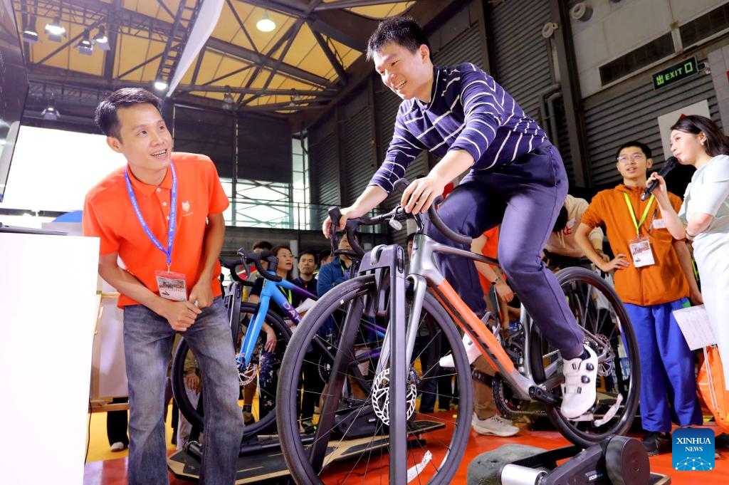 A visitor tries a cycling racing game during the 32nd China International Bicycle Fair in east China's Shanghai, May 5, 2024. The event kicked off here on Sunday, drawing about 1,460 enterprises to participate. (Xinhua/Fang Zhe)