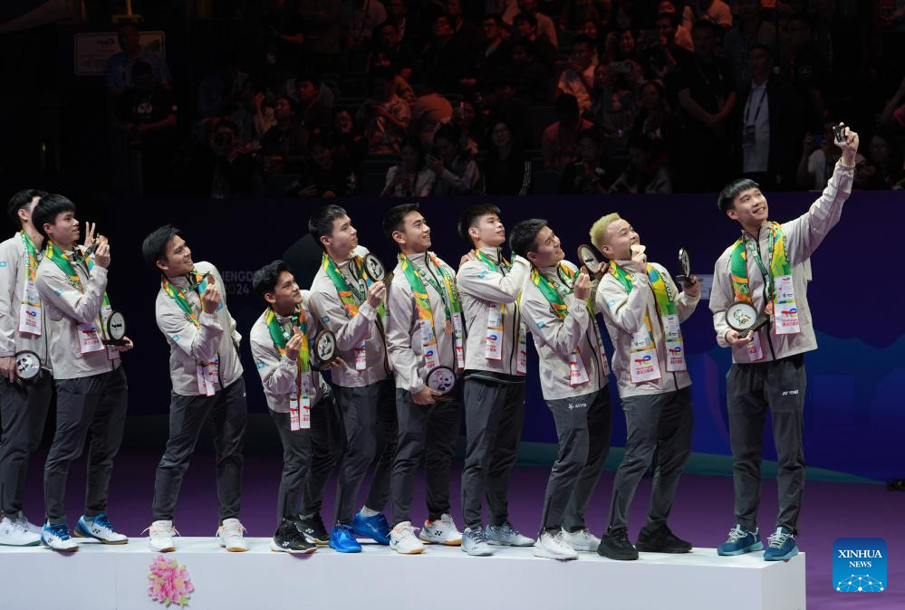 Team Malaysia take a selfie during the awarding ceremony of the BWF Thomas Cup Finals in Chengdu, southwest China's Sichuan Province, May 5, 2024. (Xinhua/Jiang Hongjing)