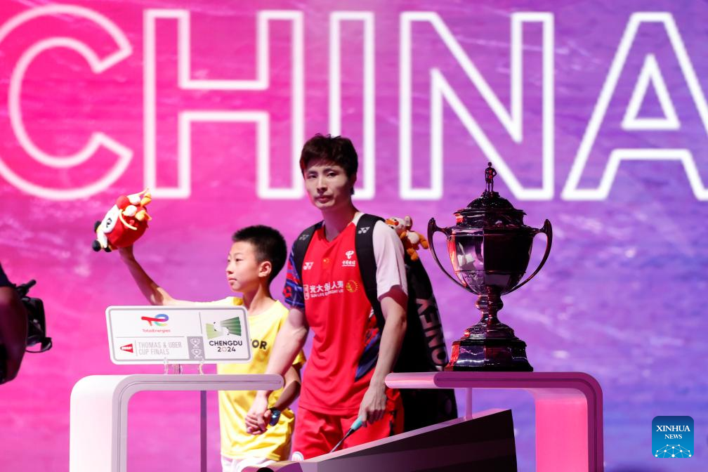Team China pose with trophy after the awarding ceremony of the BWF Thomas Cup Finals in Chengdu, southwest China's Sichuan Province, May 5, 2024. (Xinhua/Chen Bin)