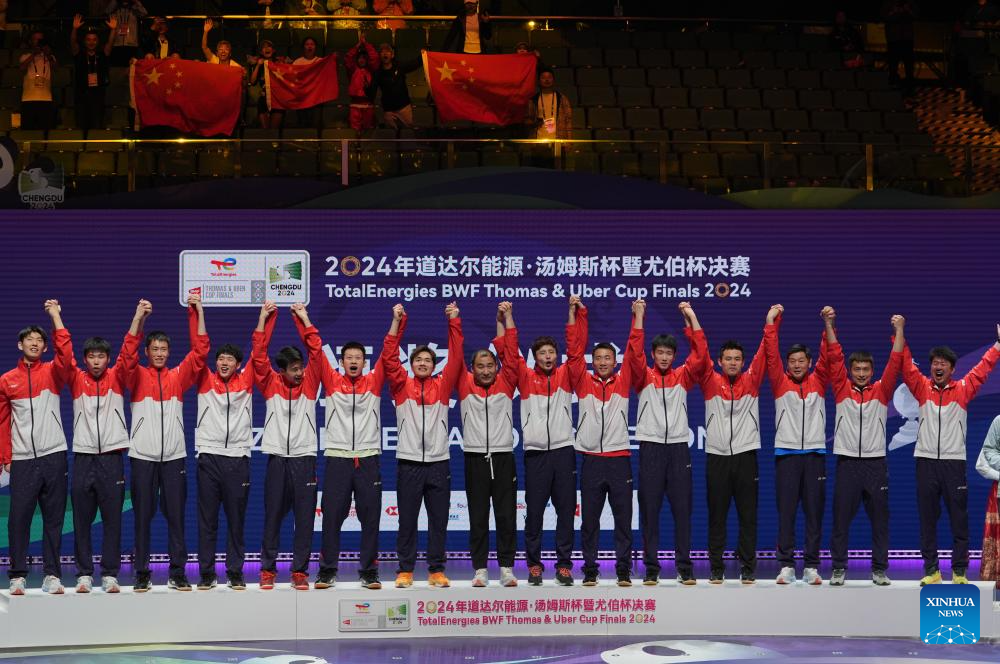 Team China celebrate during the awarding ceremony of the BWF Thomas Cup Finals in Chengdu, southwest China's Sichuan Province, May 5, 2024. (Xinhua/Jiang Hongjing)