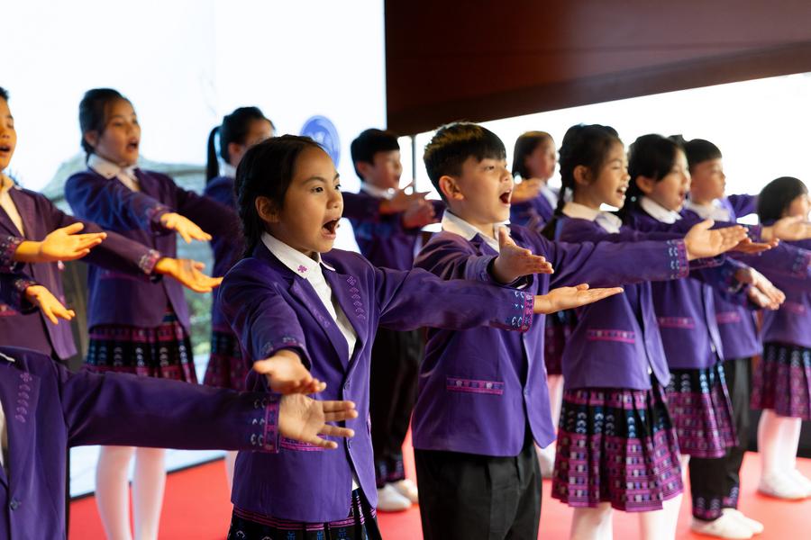 A choir consisting of children of Li and Miao ethnic groups from south China's Hainan Province performs during a Sino-French gastronomy festival aboard a boat along the Seine, in Paris, France, May 4, 2024. (Xinhua/Meng Dingbo)