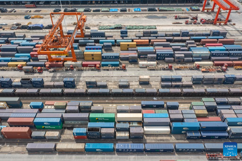 Customs officers check goods waiting to be exported via China-Europe freight trains at the Tuanjiecun Station in the Chongqing International Logistics Hub Park in southwest China's Chongqing Municipality, May 3, 2024. The Chongqing International Logistics Hub Park, which includes the Tuanjiecun Station, the dry port of the New International Land-Sea Trade Corridor, and the Chongqing Railway Port, has risen to be a major hub of international freight trains in the country's western region. (Xinhua/Huang Wei)