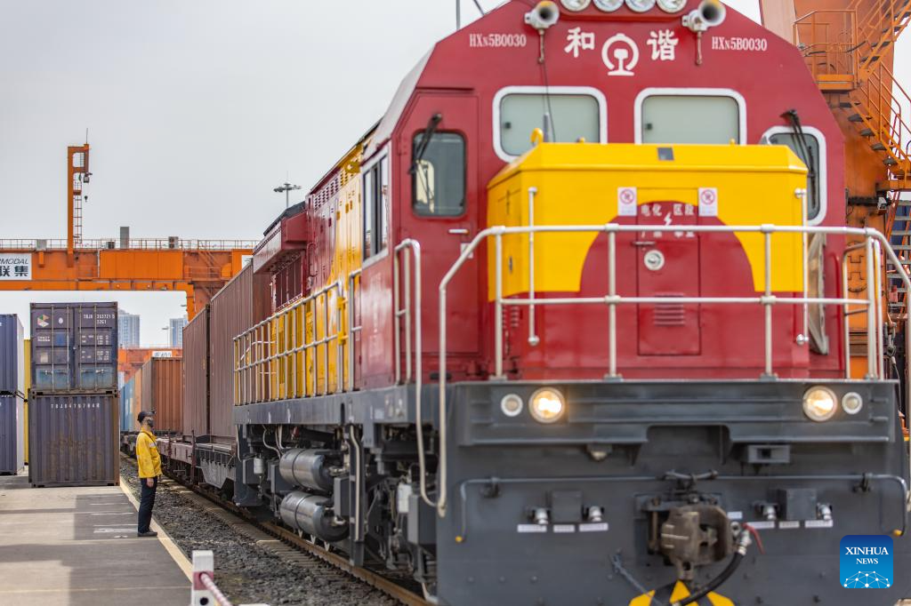 A China-Europe freight train waits to depart from the Tuanjiecun Station in the Chongqing International Logistics Hub Park in southwest China's Chongqing Municipality, May 5, 2024. The Chongqing International Logistics Hub Park, which includes the Tuanjiecun Station, the dry port of the New International Land-Sea Trade Corridor, and the Chongqing Railway Port, has risen to be a major hub of international freight trains in the country's western region. (Xinhua/Huang Wei)