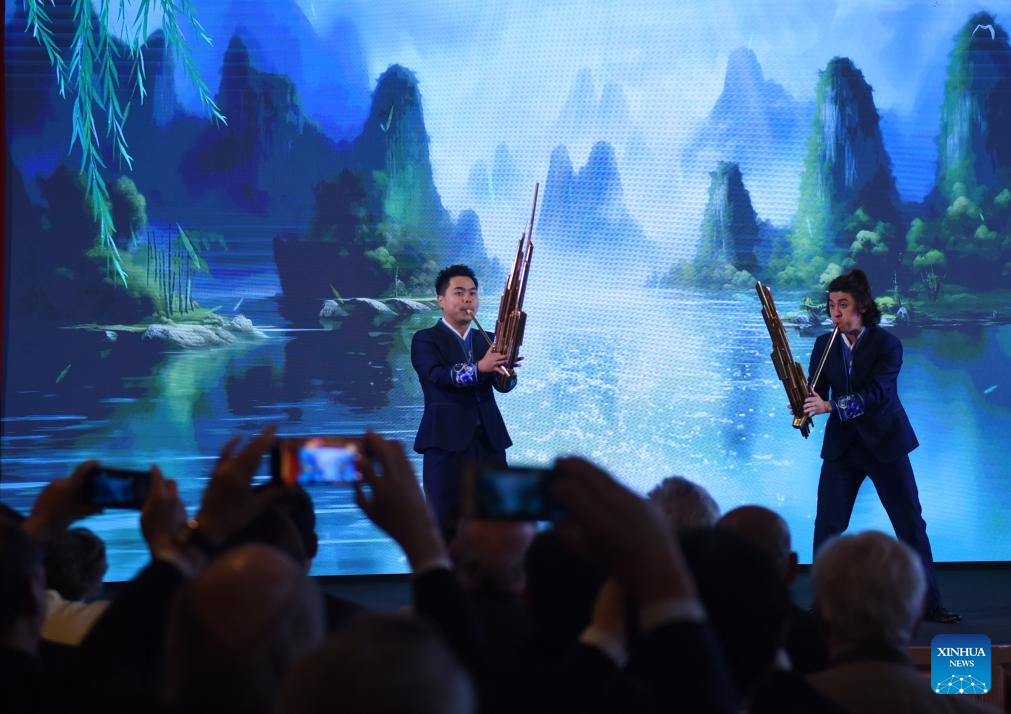 Musicians play the traditional instruments Lusheng during a Guangxi culture and tourism promotion event in Vienna, Austria, on May 7, 2024. (Xinhua/He Canling)
