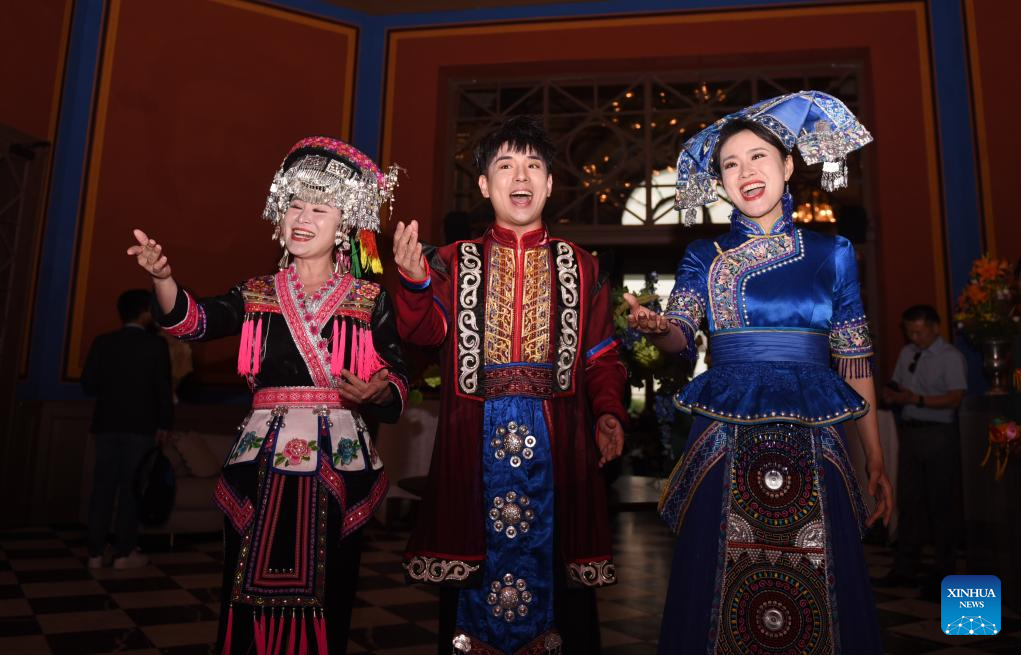 Artists perform to greet guests during a Guangxi culture and tourism promotion event in Vienna, Austria, on May 7, 2024. (Xinhua/He Canling)