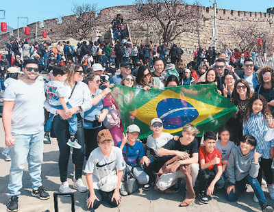 Brazilian tourists pose for a group photo at the Mutianyu Great Wall Scenic Area in Beijing. (Photo courtesy of the Mutianyu Great Wall Scenic Area)