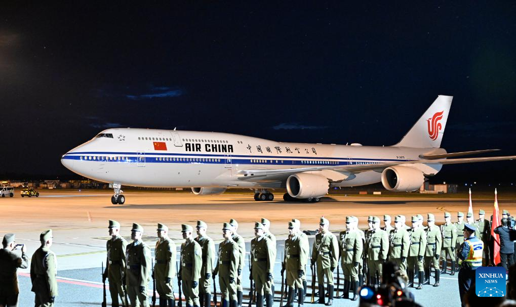 Chinese President Xi Jinping's plane arrives in Budapest, Hungary, May 8, 2024. Xi arrived here Wednesday for a state visit to Hungary. (Xinhua/Yin Bogu)
