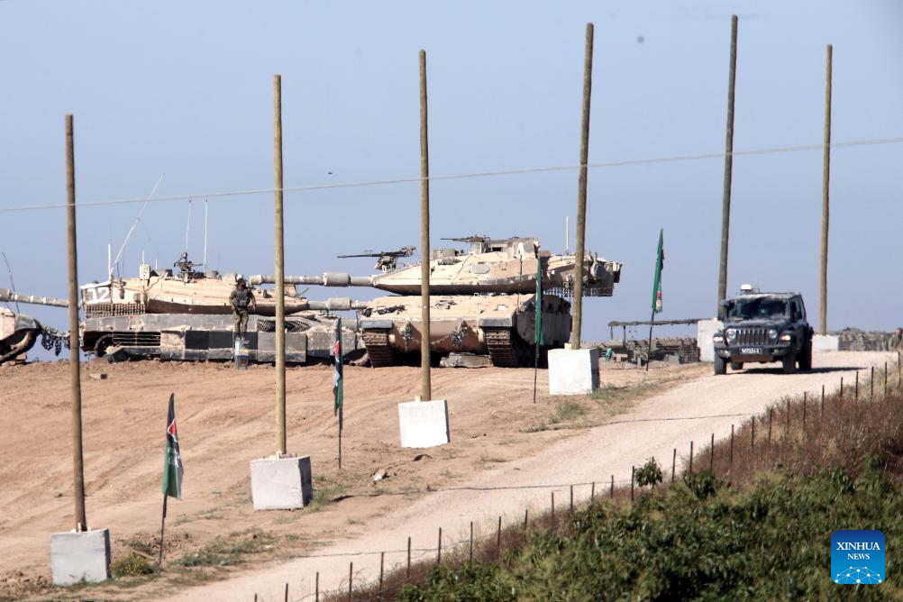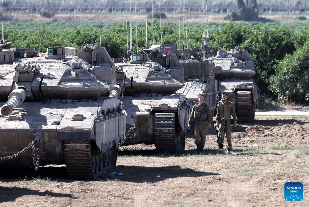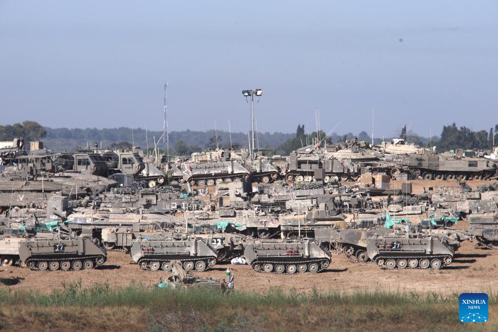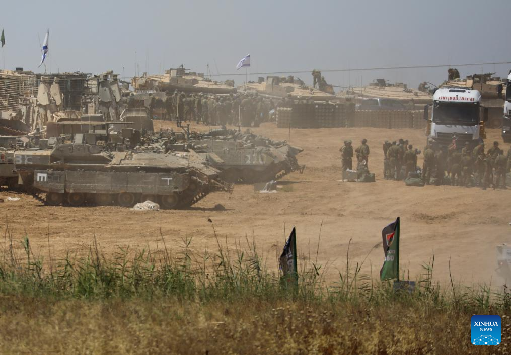 Israeli armored vehicles are deployed near the Kerem Shalom crossing in southern Israel, on May 8, 2024. Israel's army announced on Wednesday that it was continuing its ground assault on Gaza's Rafah, reporting approximately 30 casualties since the offensive began on Monday night. According to an army statement, the 30 casualties were militants, while Gaza health officials reported about 35 deaths, including a four-month-old baby. (Ilan Assayag/JINI via Xinhua)