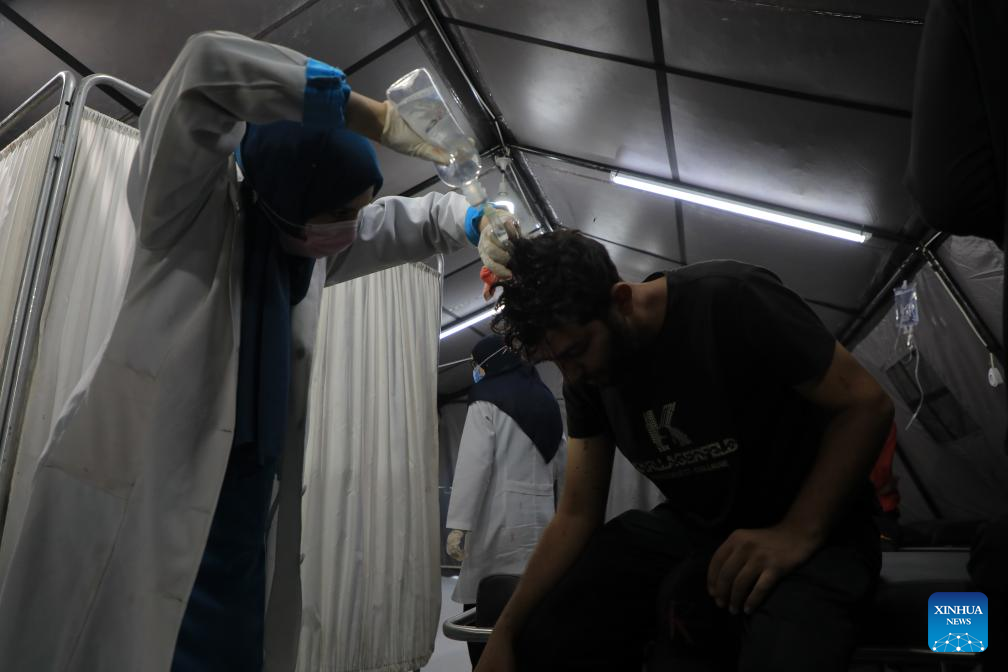 An injured man is treated at a temporary clinic in the southern Gaza Strip city of Rafah, on May 8, 2024. Israel's army announced on Wednesday that it was continuing its ground assault on Gaza's Rafah, reporting approximately 30 casualties since the offensive began on Monday night. According to an army statement, the 30 casualties were militants, while Gaza health officials reported about 35 deaths, including a four-month-old baby. (Photo by Rizek Abdeljawad/Xinhua)